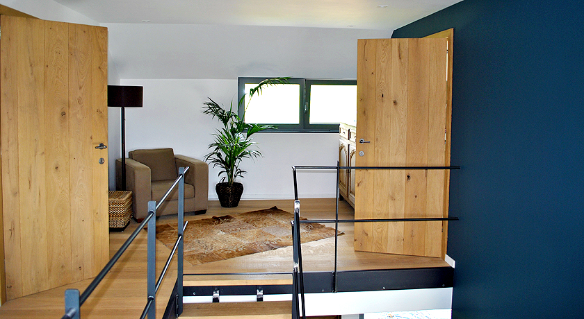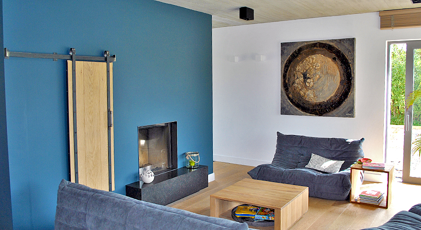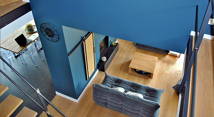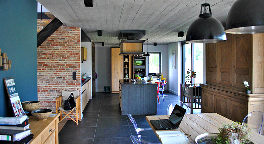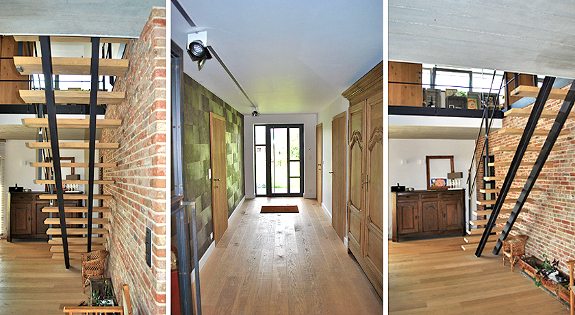 Aménagement intérieur, par le Maître de l’Ouvrage, en utilisant les matériaux et accessoires dans une expression brute : plafond en béton en utilisant des voliges pour le coffrage afin de voir le dessin du bois, mur intérieur en briques de récupération, escaliers ajourés réduits à leur plus simple expression avec marches en bois sur limons métalliques, garde-corps épurés en métal , luminaires de salle-à-manger type industriel, portes en bois massif en « planches »,…