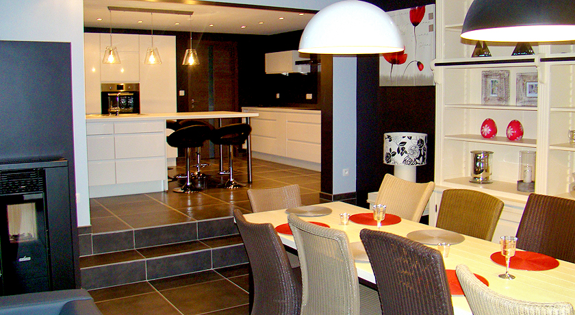 Aménagement intérieur et décoration, par le Maître de l’Ouvrage, après transformation profonde avec agrandissement d’un ancien bâtiment rural.