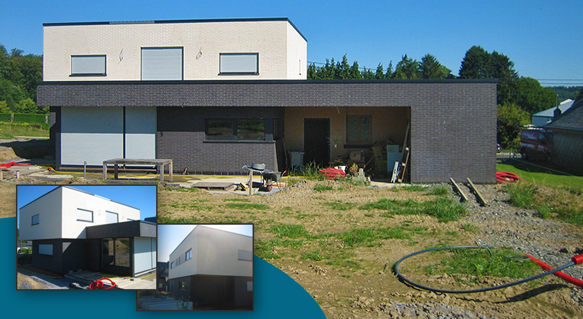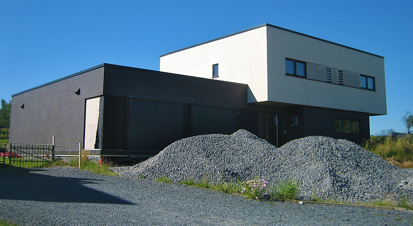 Bâtiment à toits plats construits en bois massif CLT. Ce mode de construction rapide présente une grande liberté au niveau de l’ouverture des espaces puisque le plupart des éléments de construction sont « auto-portants ». Le bâtiment a été isolé complètement par l’extérieur au moyen de panneaux d’isolant garnis de plaquettes de briques.